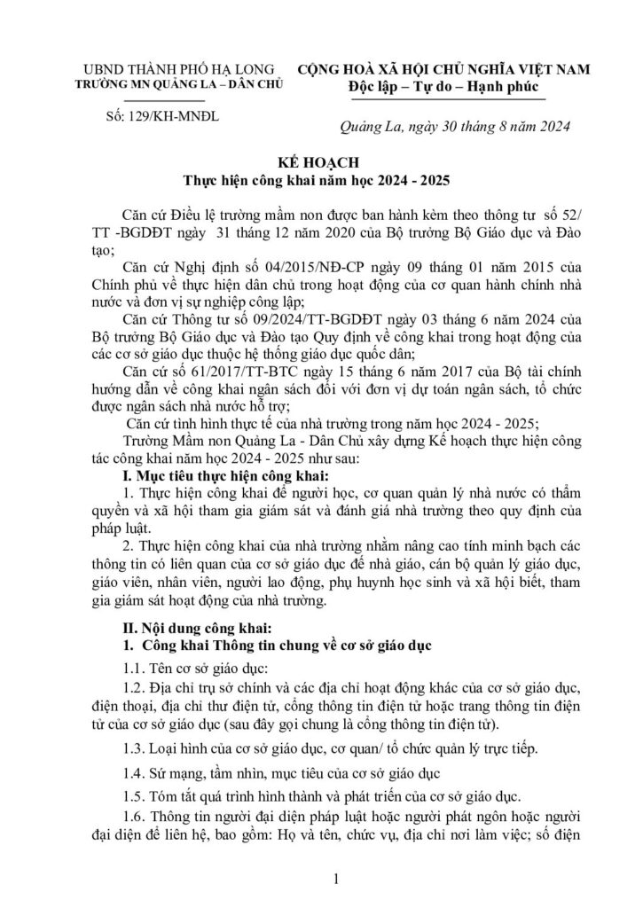 Kế Hoạch Thực hiện công khai năm học 2024-2025 Trường MN Quảng La – Dân Chủ Thực hiện công khai …